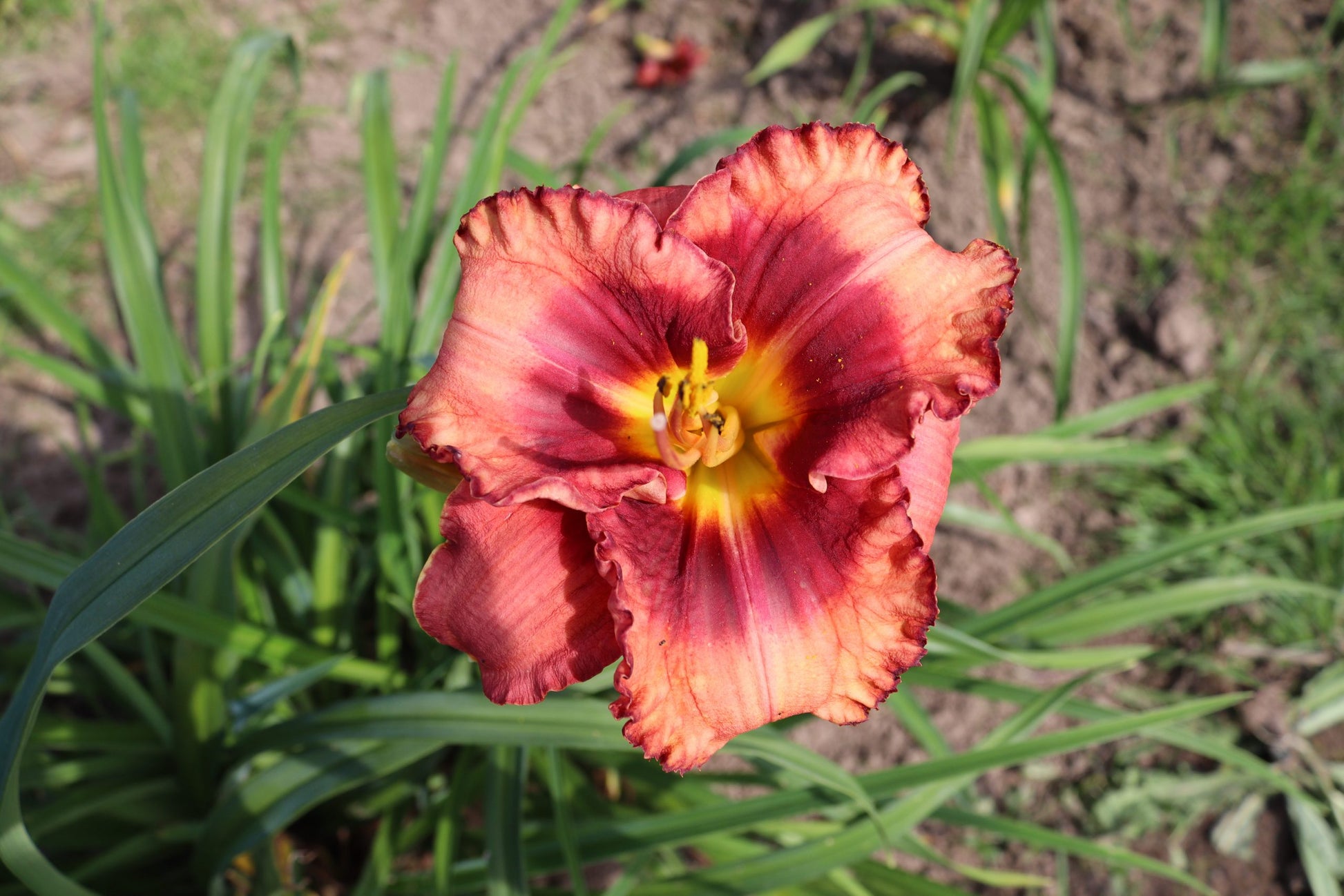 Tumšs lašu krāsas pamattonis, sarkana, plata acs, dzeltens vidus, zaļa rīklīte. Vidējo ziedlapu mala viegli krokota ar sarkanu eģi.