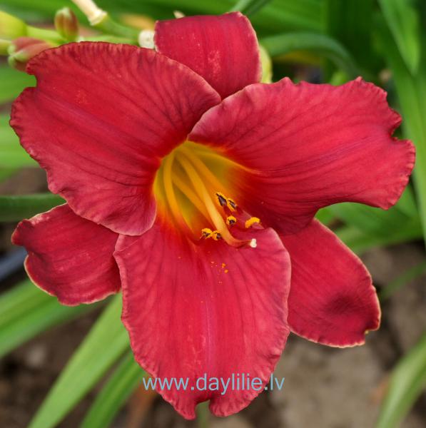 Sarkans pamattonis, dzeltens vidus, viegli krokota vidējo ziedlapu mala.