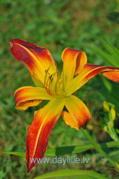 Sarkans pamattonis, dzeltens vidus, zaļa rīklīte. Uz vidējām ziedlapām starveida dzeltena līnija. Zirnekļveida.