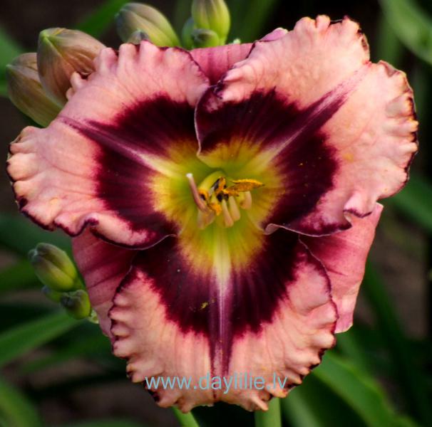 Pasteļrozā pamattonis, tumša, violetsarkana acs. Tumša, violetsarkana, stipri krokota eģe. Dzeltens vidus, zaļa rīklīte.