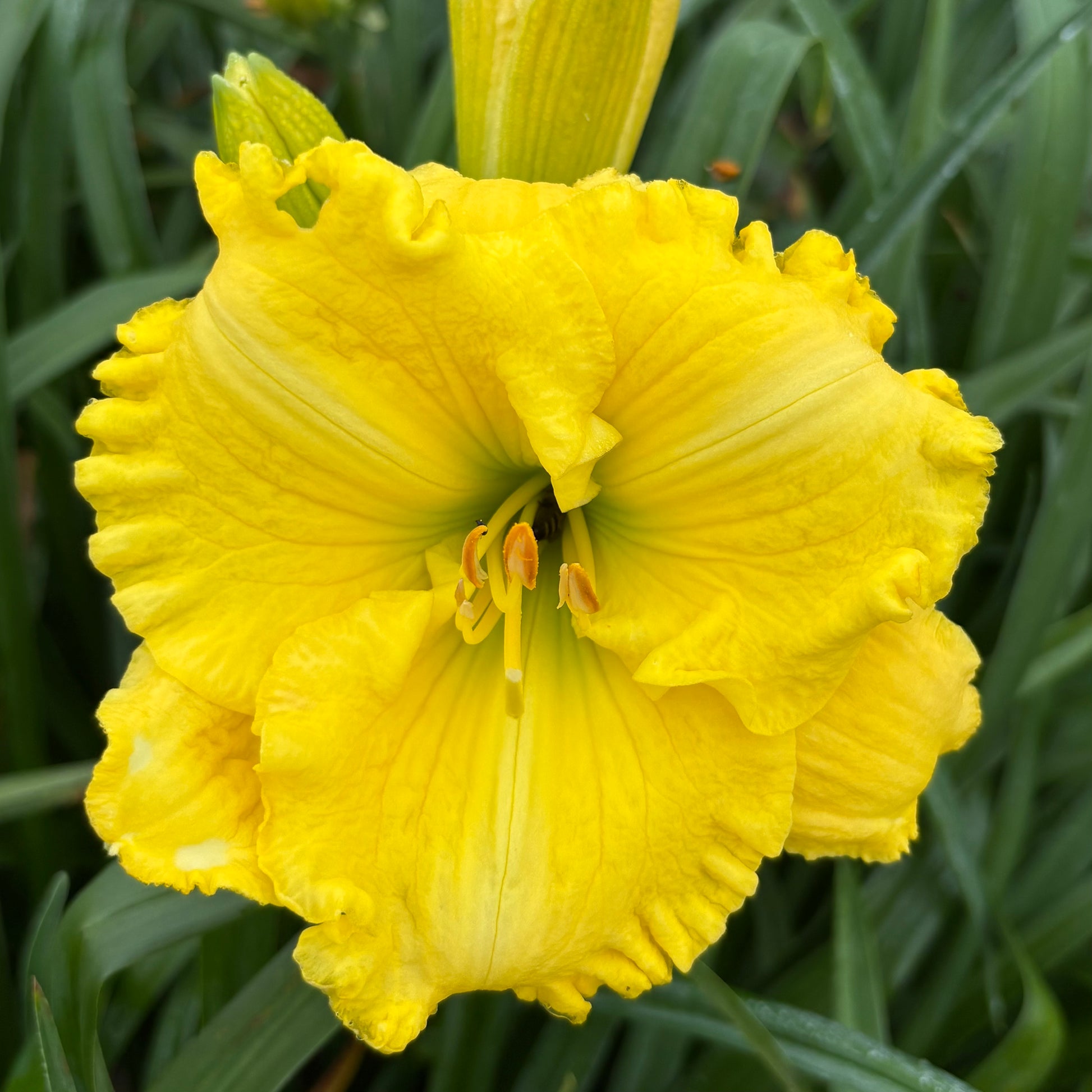 Citrondzeltena (spilgts tonis), ziedlapas rievotas. Uz vidējām ziedlapām stiprs krokojums.
