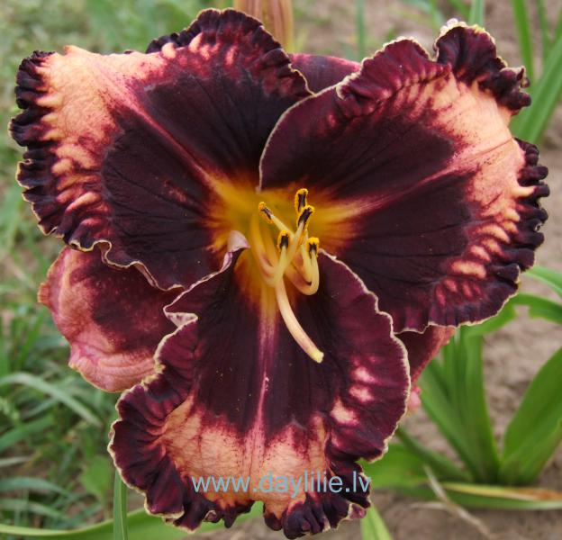 Pruun, suur, must silm, tugevalt kortsus, must äär koos kollase servaga.