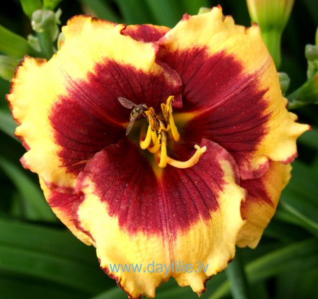 Tume kollane suure punase silmaga ja kortsus servaga, eriline lillekuju.