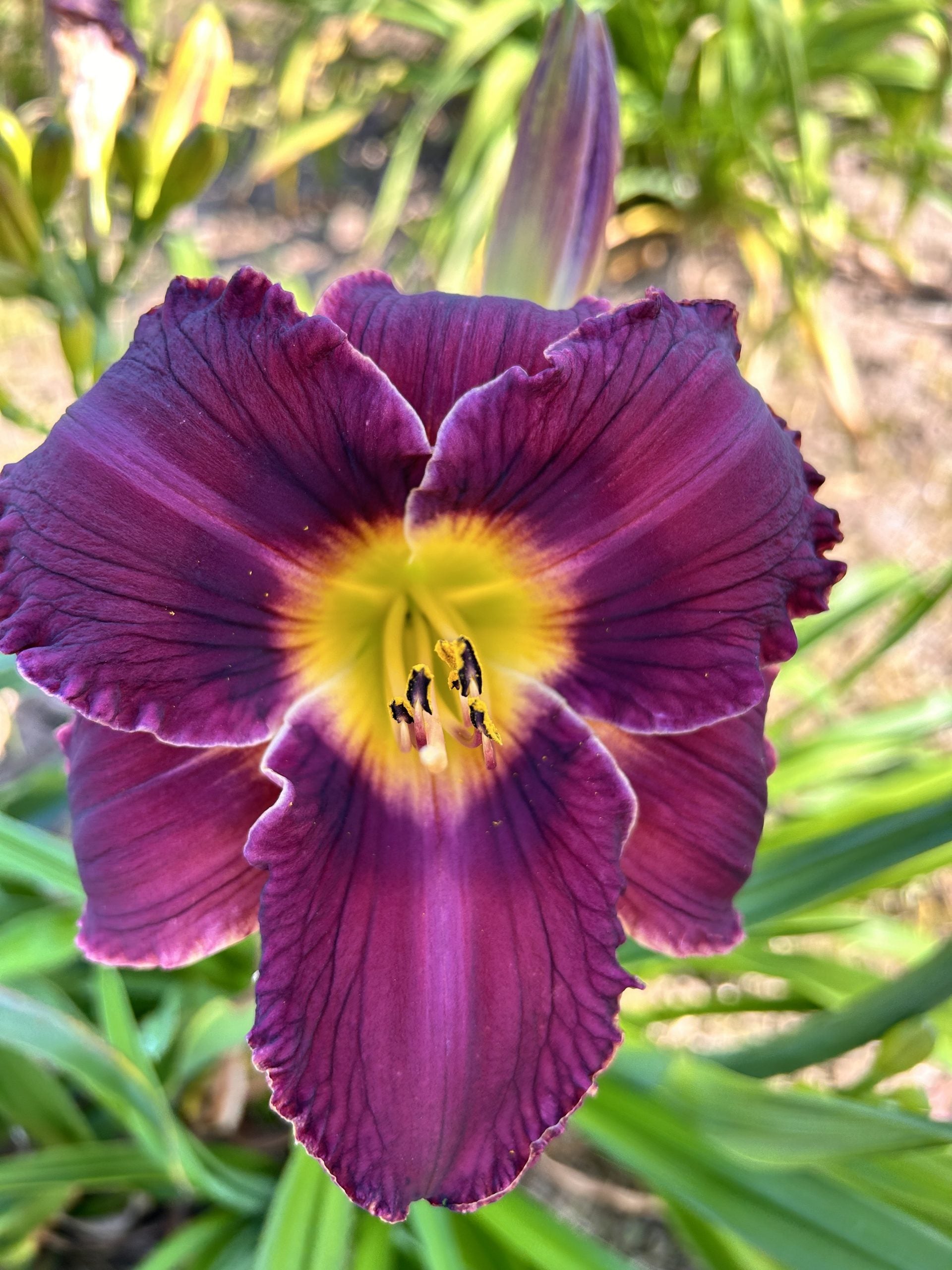 Tume violetne, jahe põhitoon, tumedad värvid silm, kollane keskmine, hele, kergelt kortsus serv.