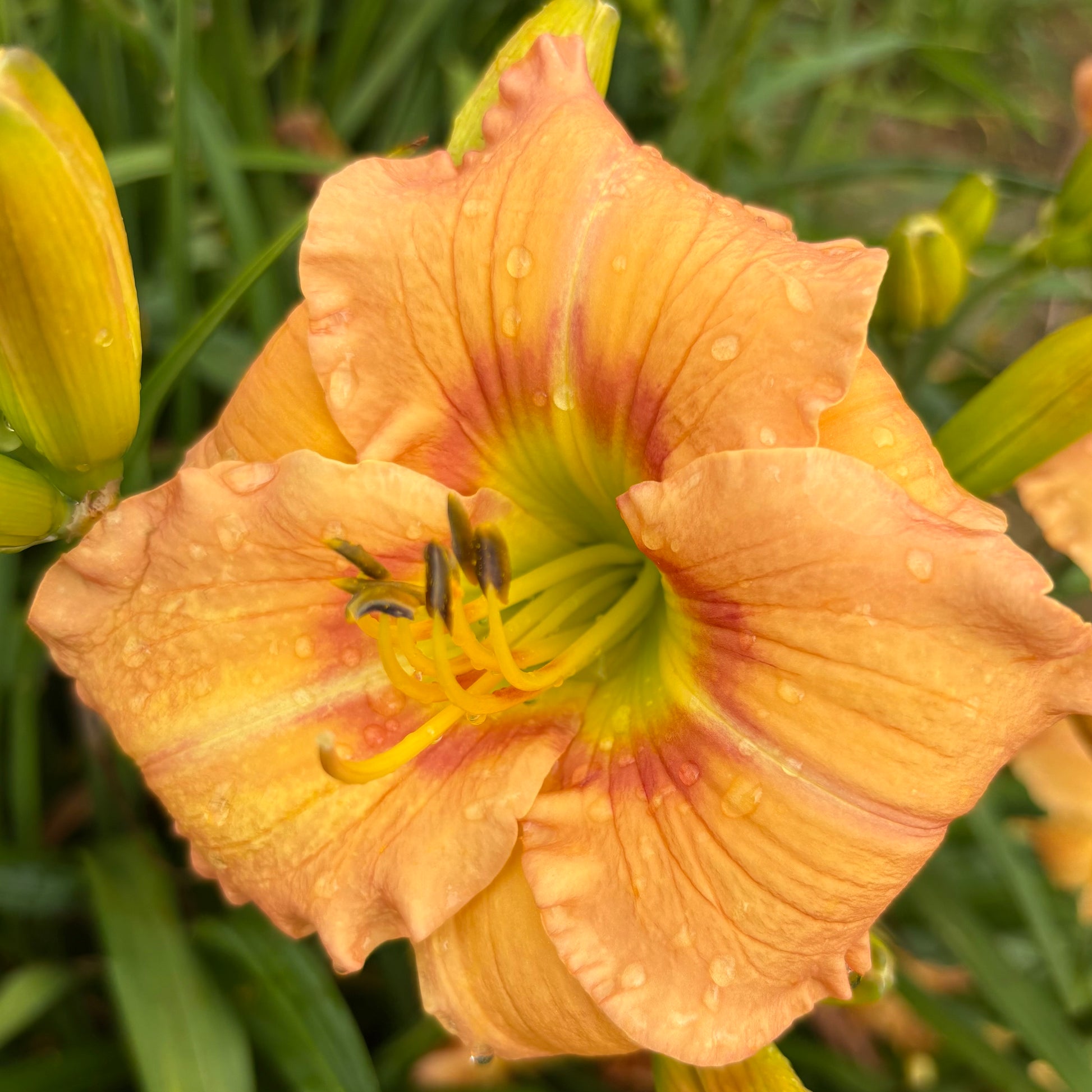 Persiku krāsas pamattonis, liela, sarkana acs, zaļš vidus un rīklīte. Ziedlapas atliektas, veidojot apaļu formu. Uz vidējām ziedlapām neliels krokojums.