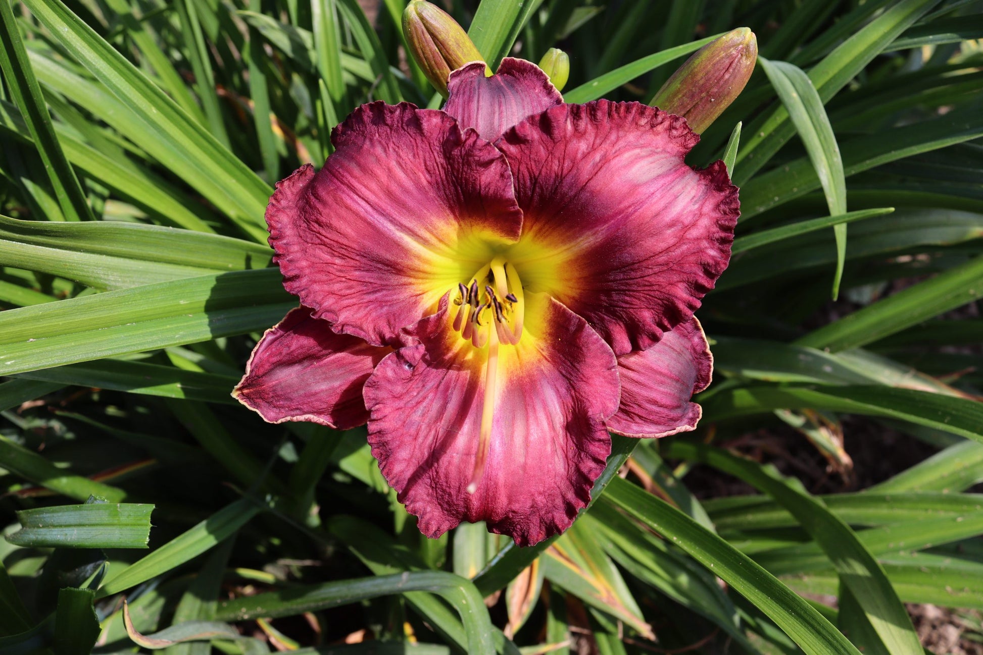 Tume lilla värv, tumedam lilla silm, kollane lille keskus, kortsus serv.
