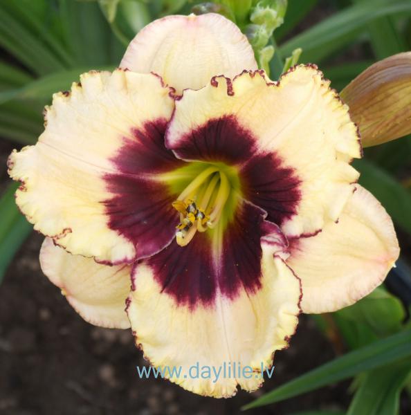Kreemvalge musta silmaga ja musta, tugevalt kortsulise äärisega.