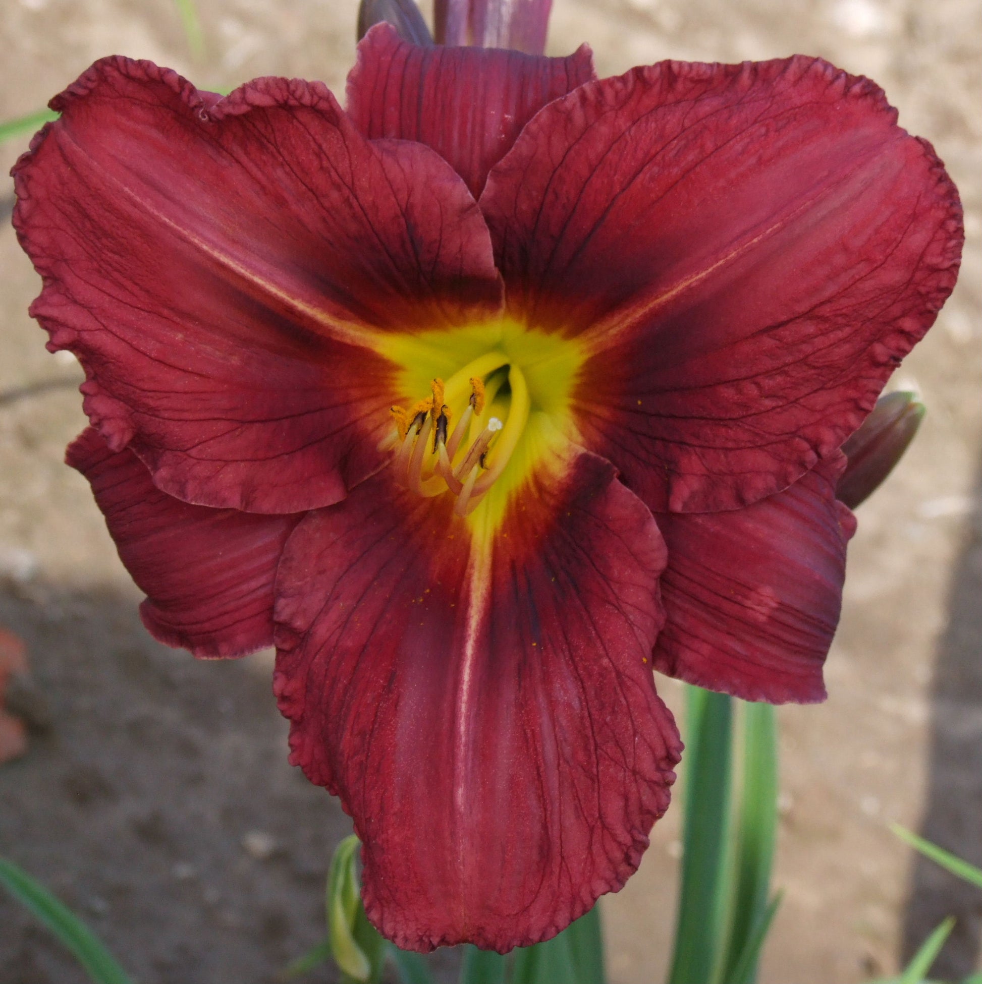 Tumšs, sarkani violets pamattonis, tumši violeta acs, dzeltens vidus. No vidus uz vidējām ziedlapām iziet starveida gaišāka līnija. Vidējo ziedlapu mala viegli krokota.
