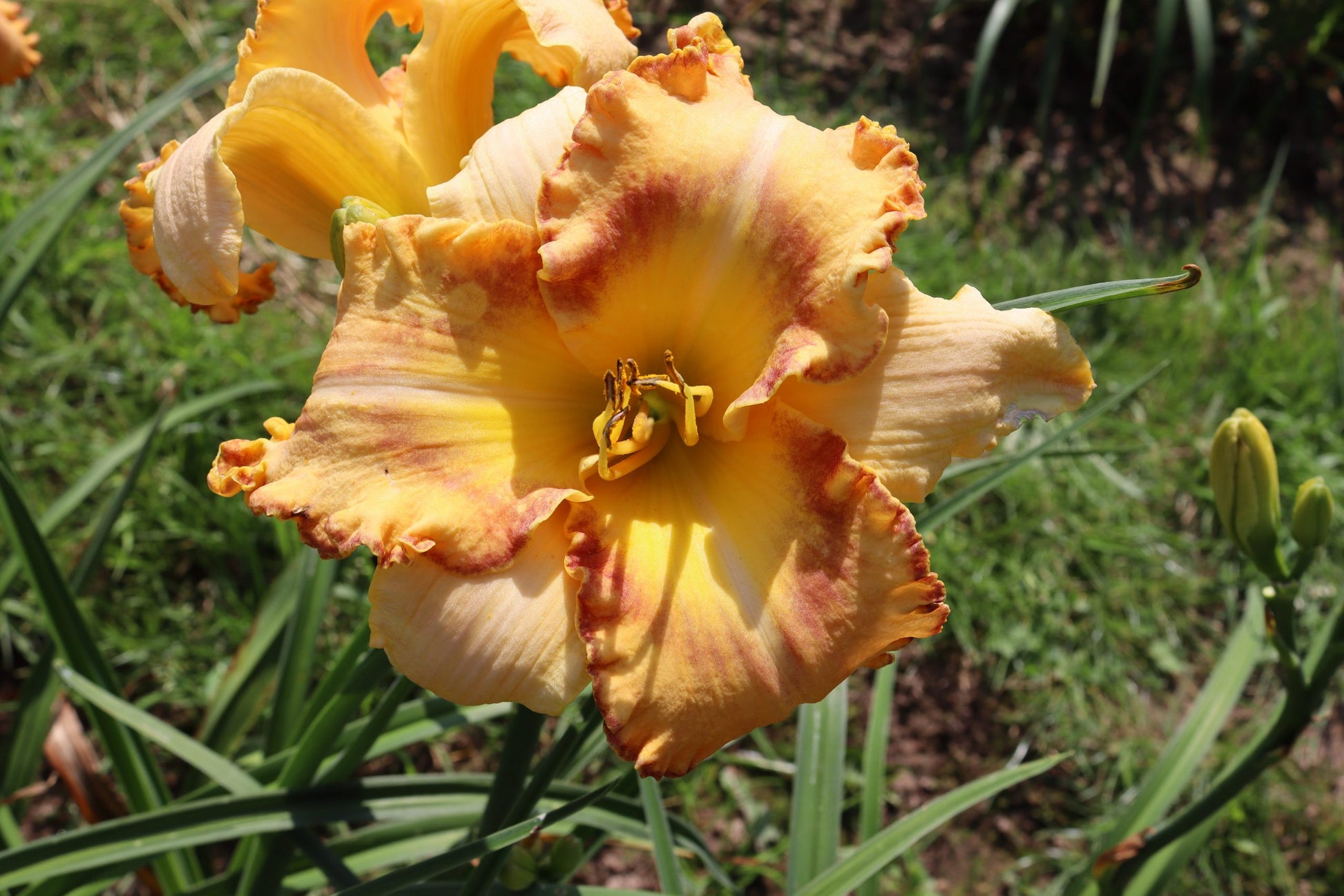 Liivakollane värv, kollane lille keskus, tumepruun kortsus serv.