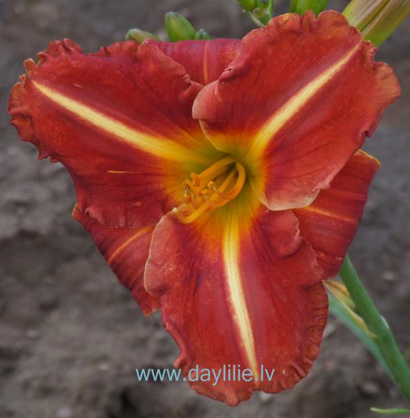 Oranž, kolmnurkne õis, millel on valge triip õielehe keskel.