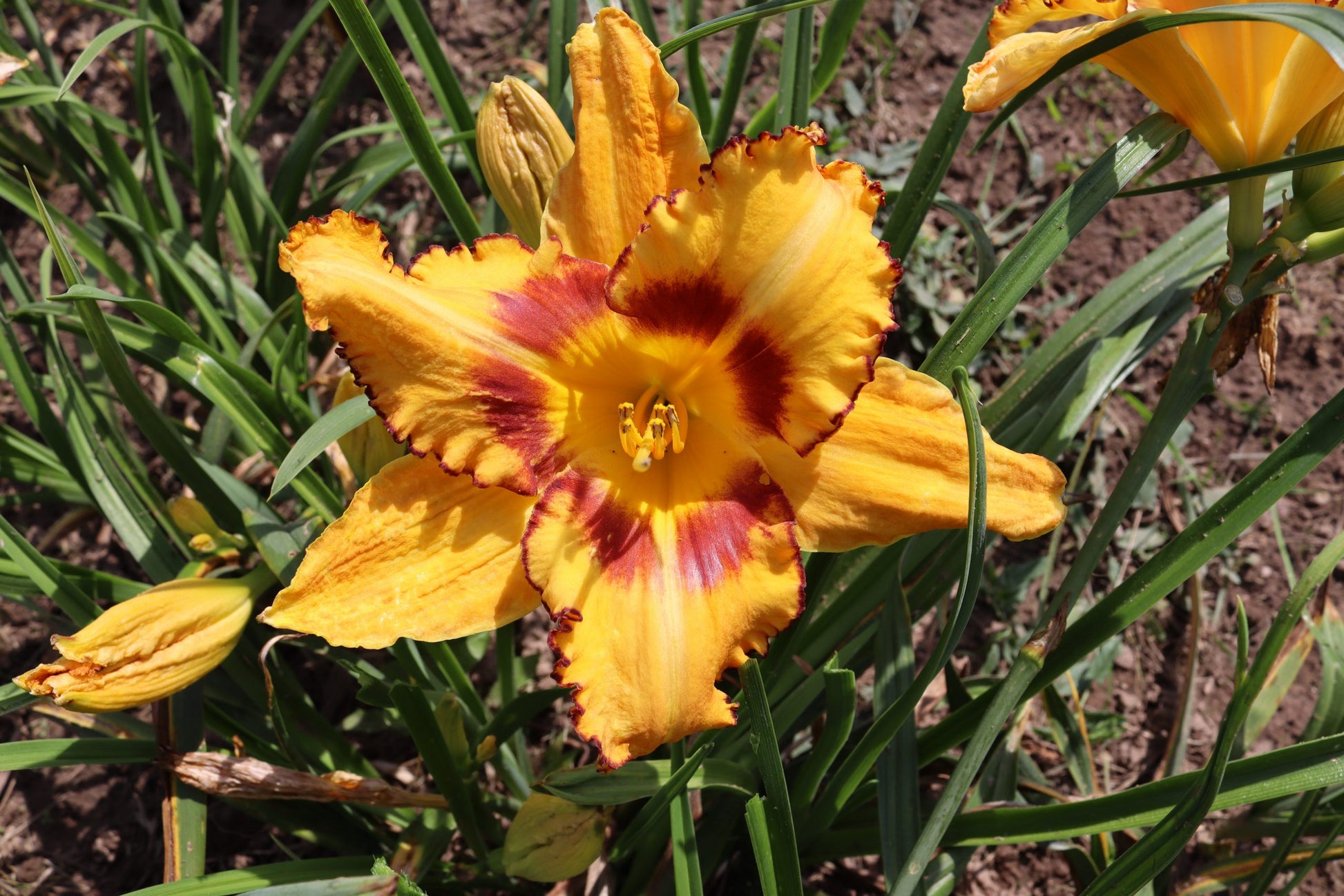 Tume kollane värv, tume punane silm, kollane lille keskus, tume punane-kortsus serv.