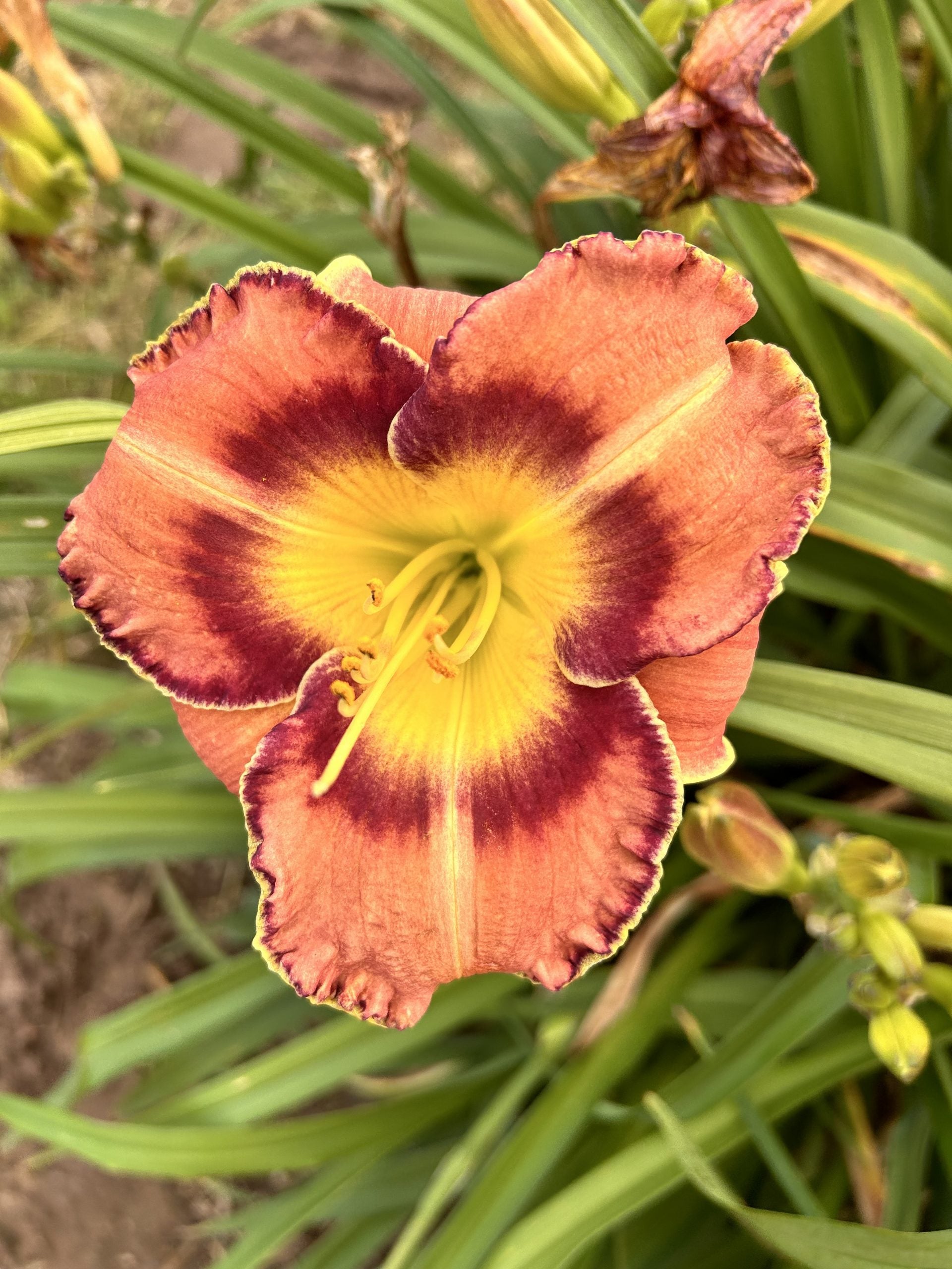 Heledat pruun pastelltoon, suur kollane keskus punakaspruuni rõngakujulise silmaga, kirju kortsus serv. Keskmiste õielehtede peal kollane joon.