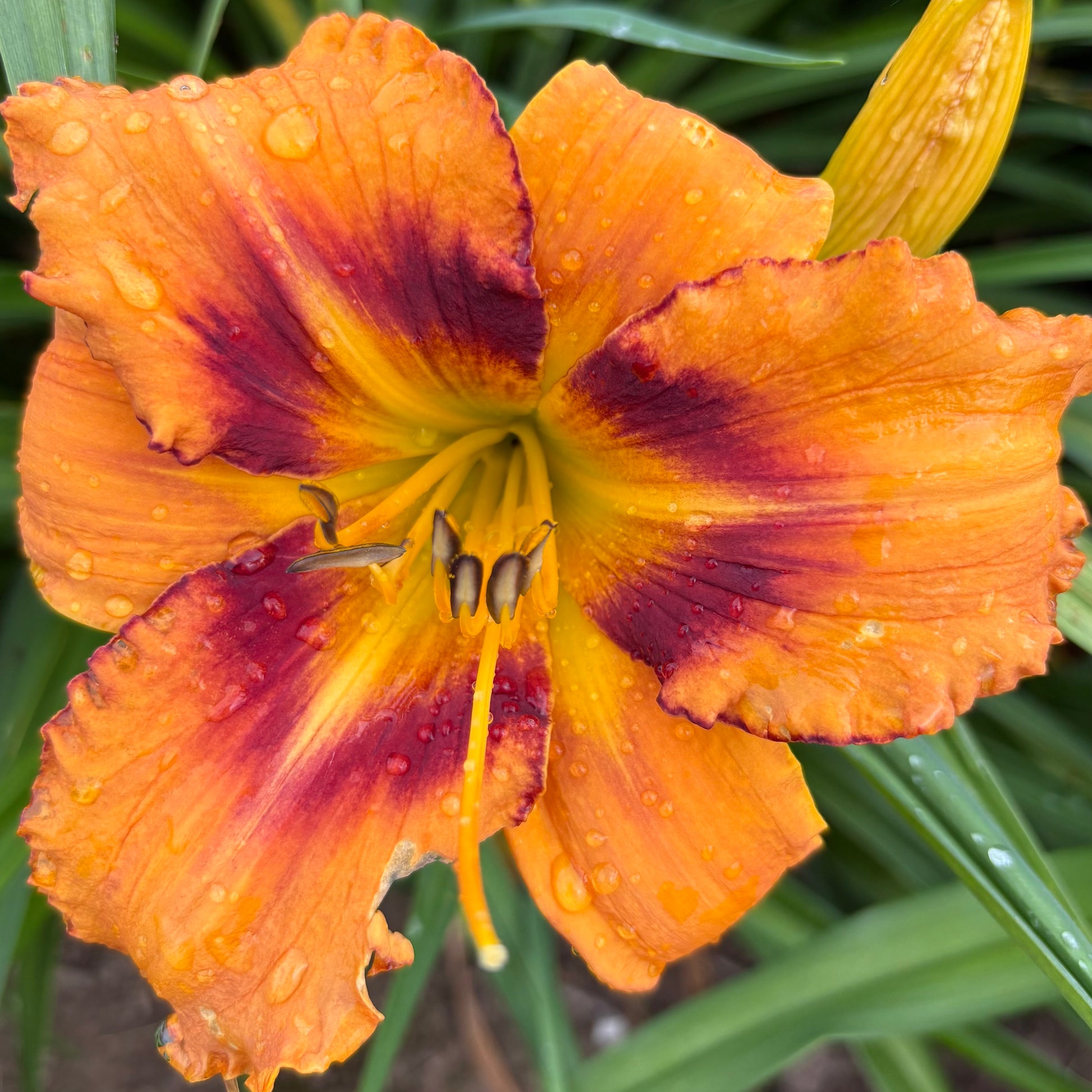 Dzelteni brūns pamattonis, brūni violeta, iestiepta acs, dzeltens, trīsstūrveida vidus, zaļa rīklīte. Vidējās ziedlapas viegli krokotas ar brūni violetu malu.