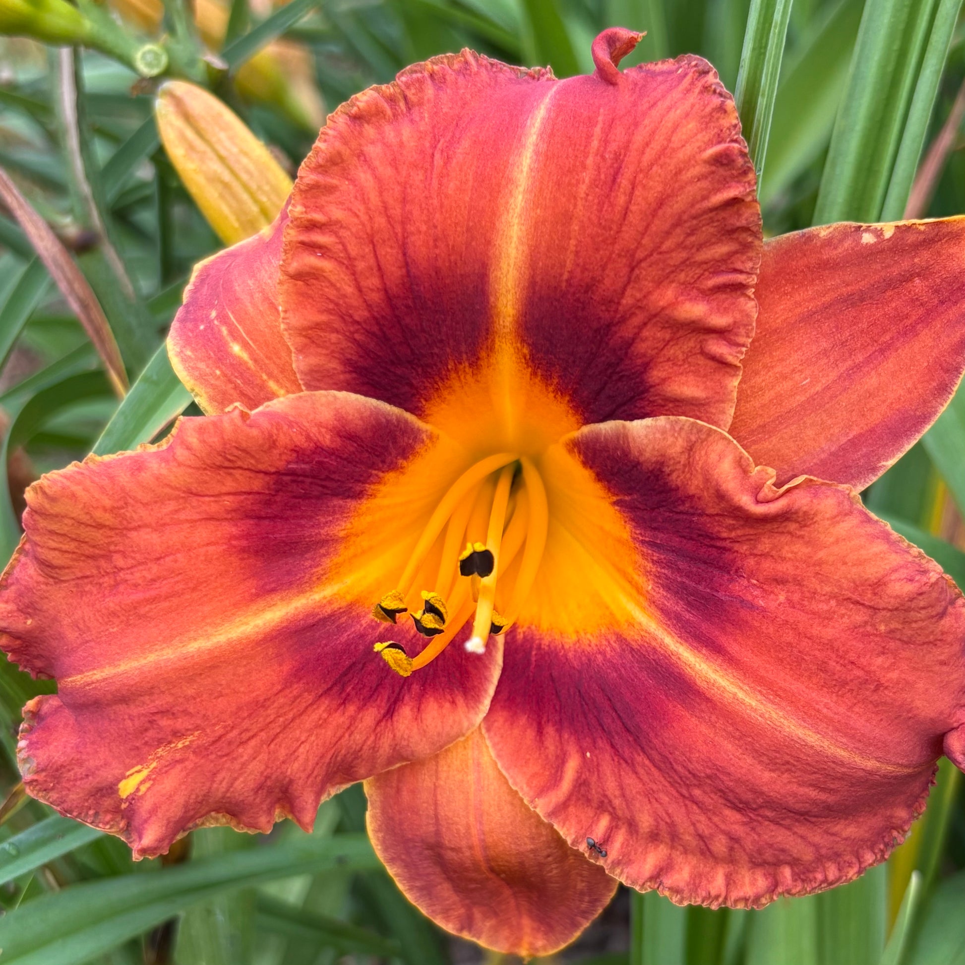 Oranži brūns pamattonis, liela, brūni violeta acs, dzeltens vidus. Uz vidējām ziedlapām starveida gaiša līnija un viegls krokojums.