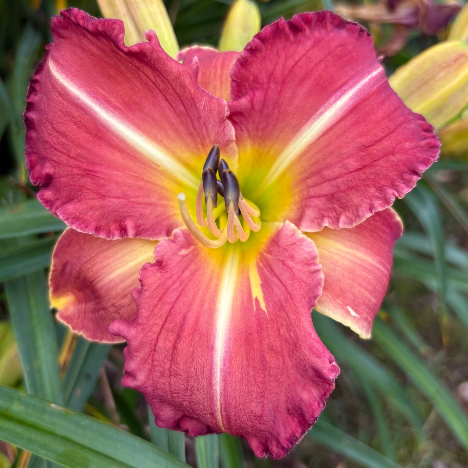 Sārti rozā pamattonis, dzeltens vidus, zaļa rīklīte. Uz vidējām ziedlapām izteikta balta līnija un viegls krokojums.