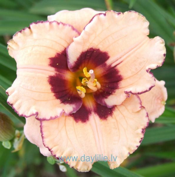 Sīkziedu, zemā, viegli krokotas ziedlapiņas ar tumšu aci, tumša eģe.