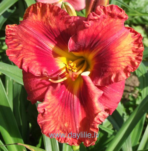 Lielziedu, tumši sarkana ar tumšu aci, viegli krokotas ziedlapiņas.