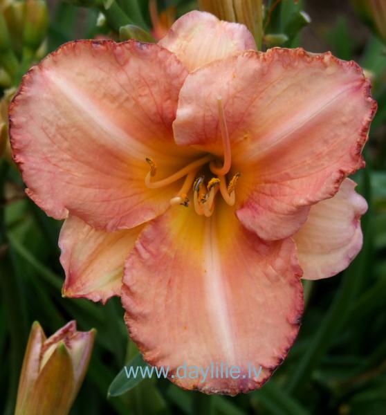 Gaiši sārta ar sarkanu, krokotu maliņu.