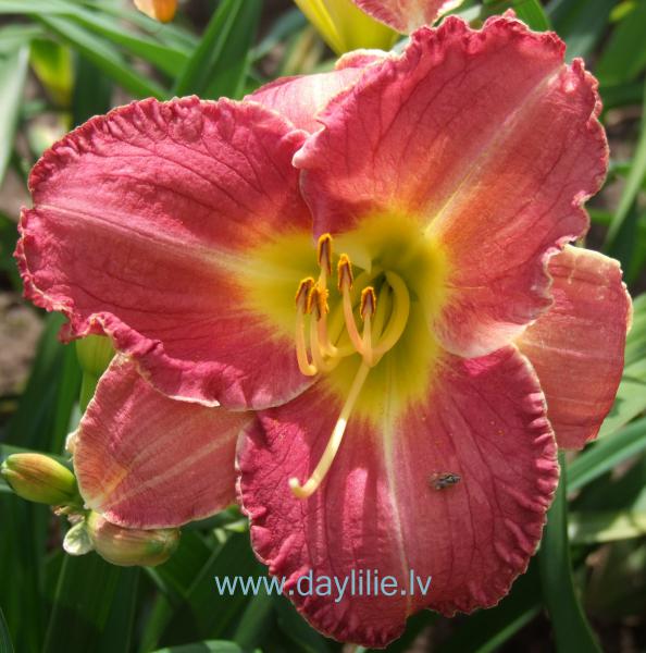 Liels zieds, rozīgi sarkans ar krokotu eģi (maliņu).