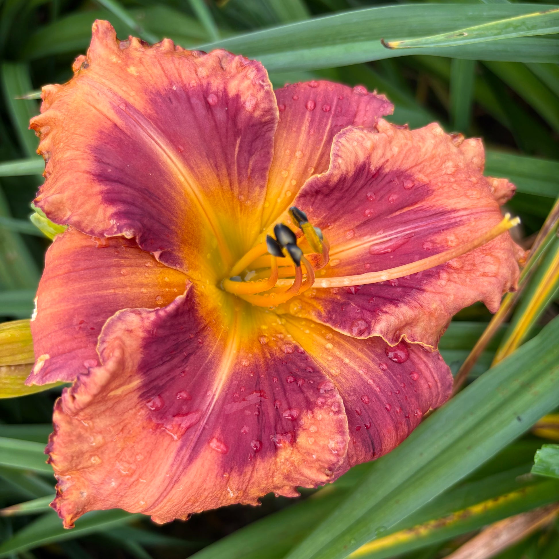 Tumšs lašu pamattonis, liela violeta acs, dzeltens vidus, zaļa rīklīte, vidējās ziedlapas viegli krokotas.