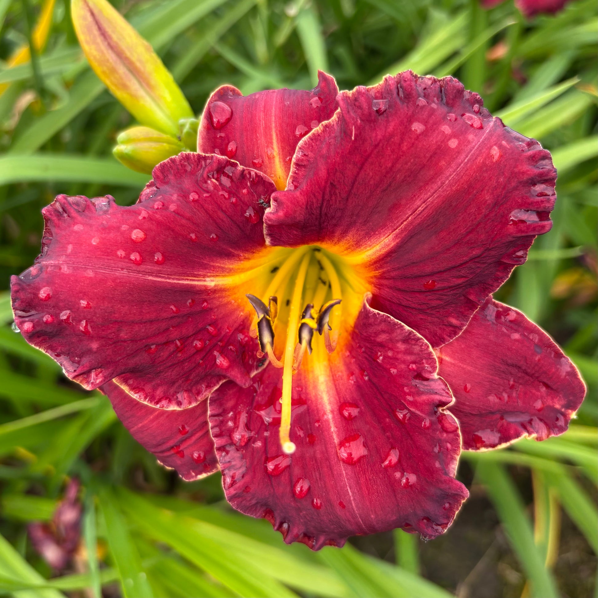 Vīna sarkans pamattonis, dzeltens vidus zaļa rīklīte. Uz ziedlapām viegls krokojums. Ziedlapu mala gaiša.