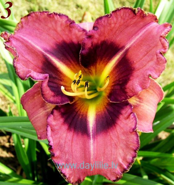 Темно-розовая, с темно-фиолетовым глазом, гало, сильно сморщенный темный край.